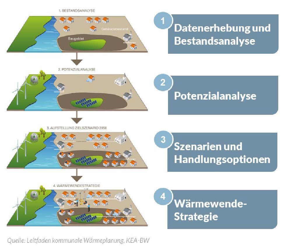 Ziel einer kommunalen Wärmeplanung ist es, die nachhaltigste und kosteneffizienteste Wärmeversorgung auf lokaler Ebene zu ermitteln und zu gestalten. Der Ablauf der Wärmeplanung ist gesetzlich vorgeschrieben und folgt den nachfolgenden Schritten.